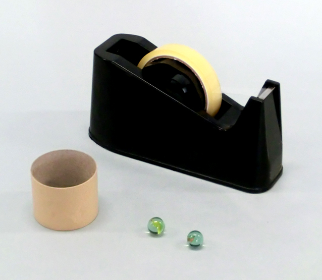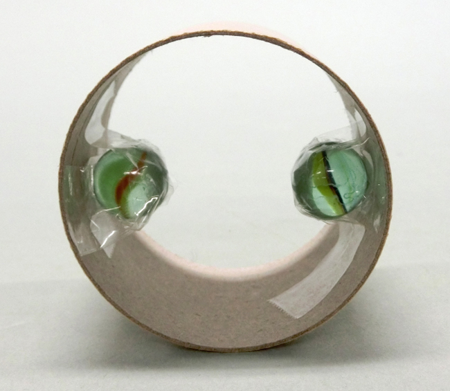 用意するもの: 紙管1本、ビー玉2個、セロハンテープ