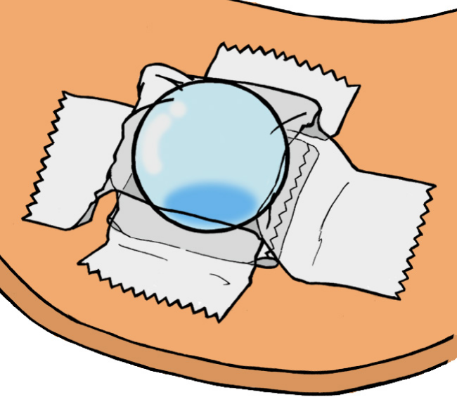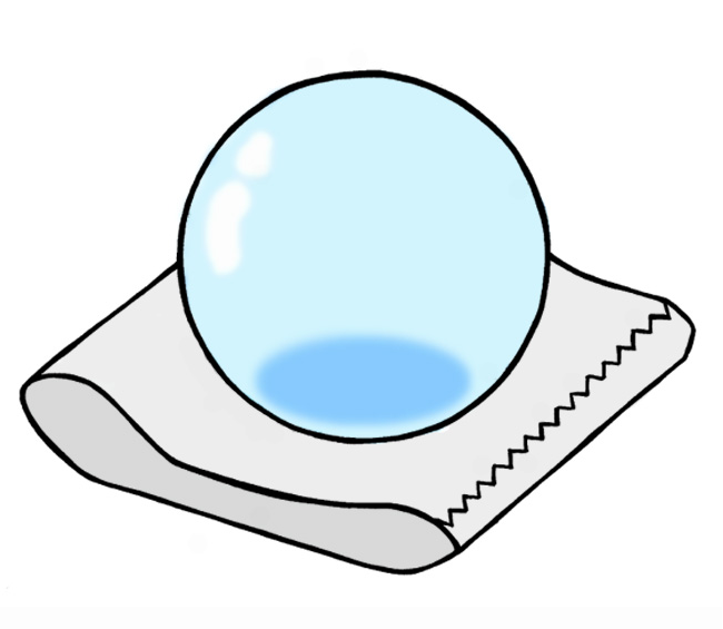 ①セロハンテープの粘着面が表になるように輪をつくり、ビー玉に貼ります。