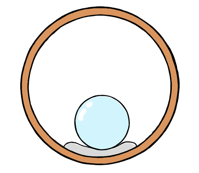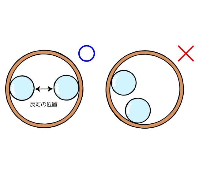 ④2つ目のビー玉を、1つ目のビー玉と反対の位置に貼ります。ビー玉の位置がかたよると、よく転がりません。