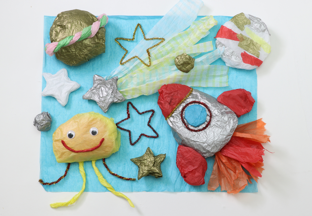 ロケットと星をつくりました。金色と銀色のおはながみを使い、光沢を表現しました。