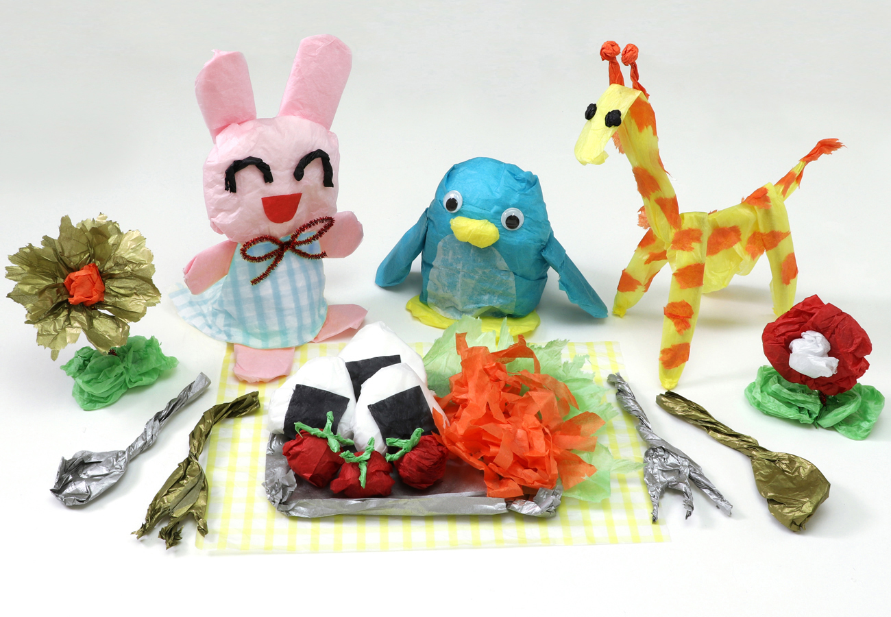 チェックのおはながみを使って、華やかな作品をつくりました。ペンギンとうさぎは胴体にティッシュを詰め、土台にすることで立たせています。