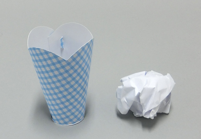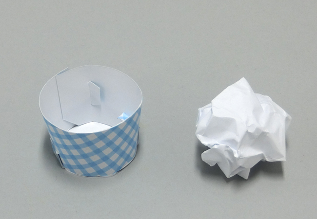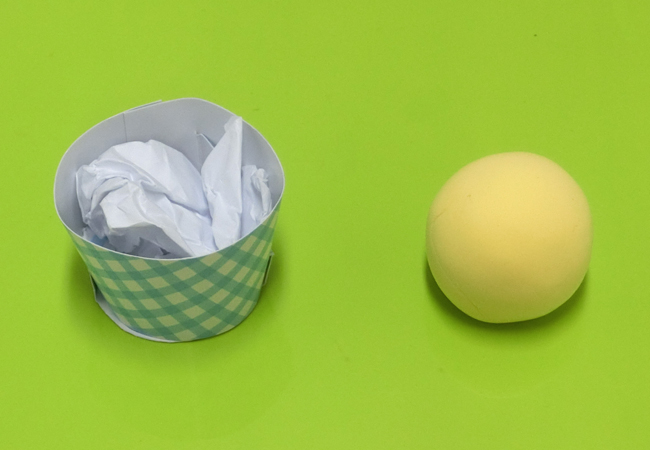 ①ミニカップと丸めた紙などを用意します。