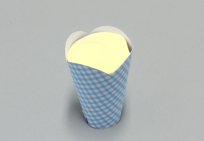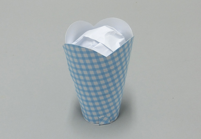 ②カップの上から1cm程まで、丸めた紙を詰めます。