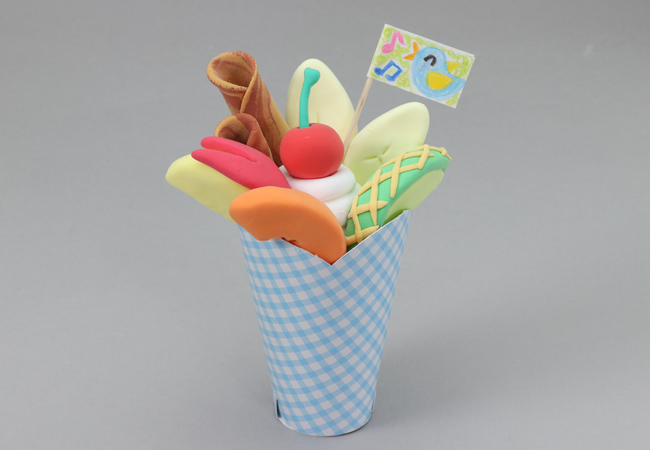 ④土台の上にフルーツなどの飾りをのせ、パフェの完成です。
