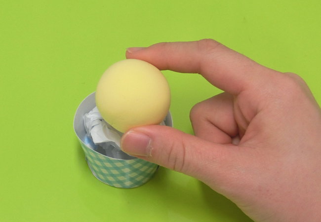 ②カップの半分くらいまで、丸めた紙を詰めましょう。