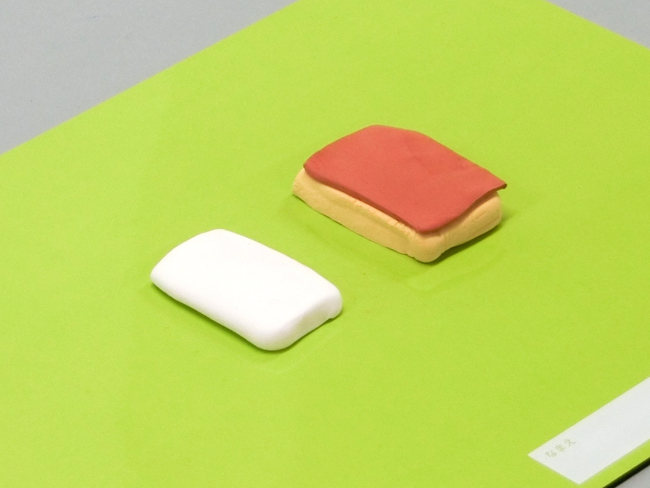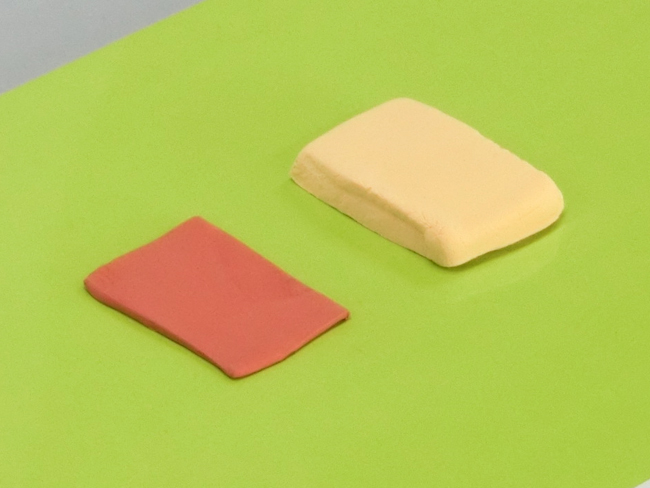 ⑤同じように、厚さ5mmほどにのばした白色のねんどを長方形に整えます。