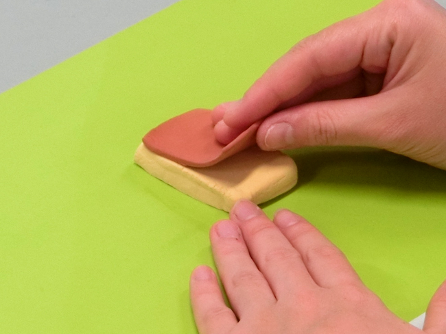 ④薄黄色のねんどの上に茶色のねんどを重ねます。
