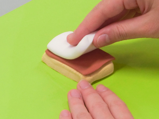⑥茶色のねんどの上に白色のねんどを重ねます。
