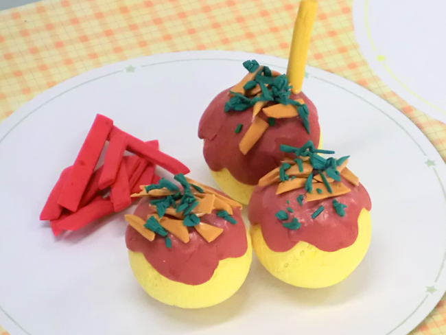 切ったねんどをたこやきの上にまぶすことで、青のりを表現しています。同じように薄くのばしたねんどを細く切り、かつおぶしや紅しょうがをつくることもできます。
