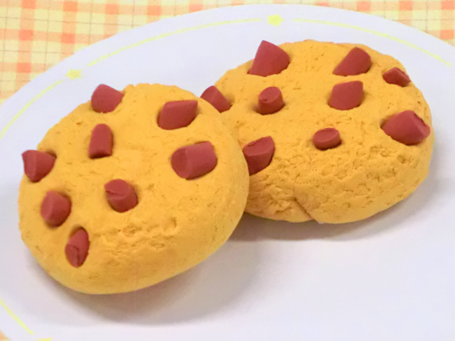 細かく切ったねんどをクッキーが乾く前にうめることで、チョコチップを表現しています。クッキーの表面は、歯ブラシでたたいて質感を出しています。