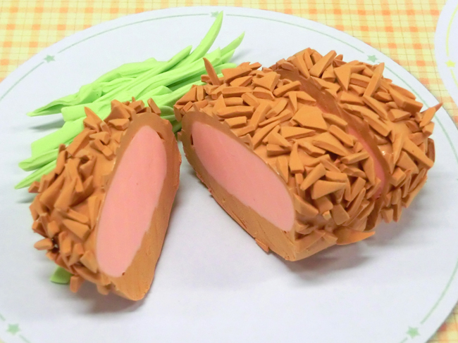 ピンク色のねんどを茶色のねんどで包み、とんかつの肉と衣を表現しました。乾かしたねんどを細かく切って衣をつくると、より本物に近くなります。