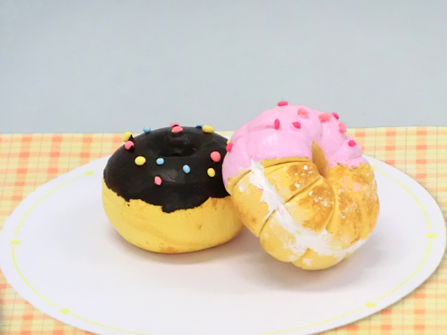 ストローで真ん中に穴をあけ、ドーナツをつくりました。木工用接着剤に絵の具を混ぜ、チョコレートソースを表現しています。