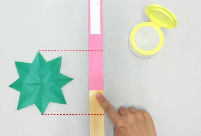 ①飾りの大きさに合わせて、紙テープにのりをつけます。