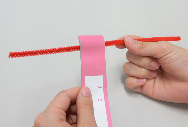 ①紙テープの上の輪にモールを通します。
