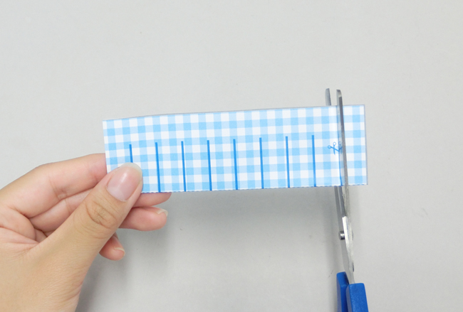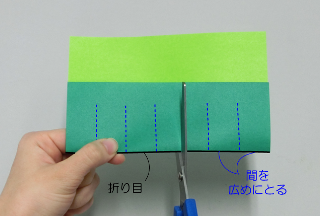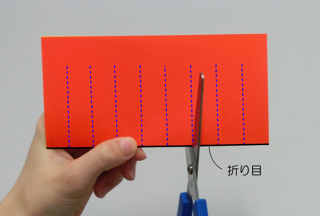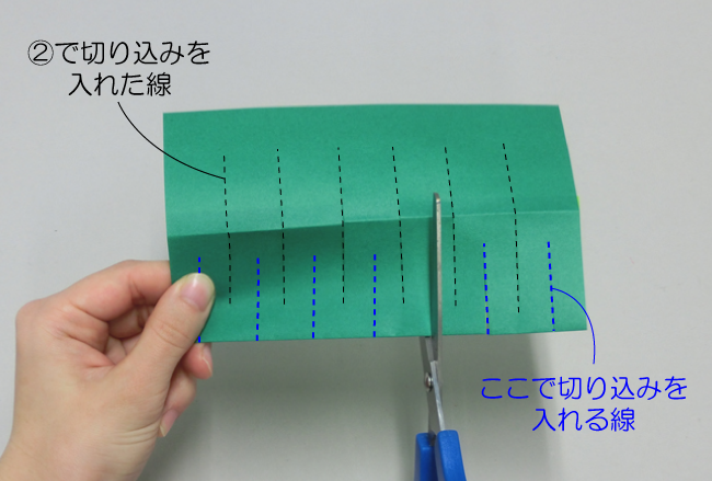 ②折り目の側から同じ長さに切り込みを入れます。線と線の間を広めにとるようにしましょう。
