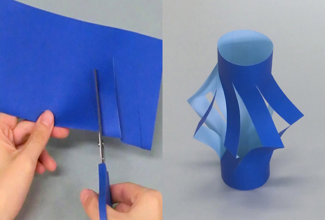 ⑥色がみを開いて丸め、両端をのりで貼り合わせます。