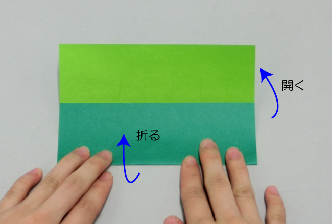 ④最初に折った部分を開き、続けて反対側も3分の1ほどの位置で折ります。
