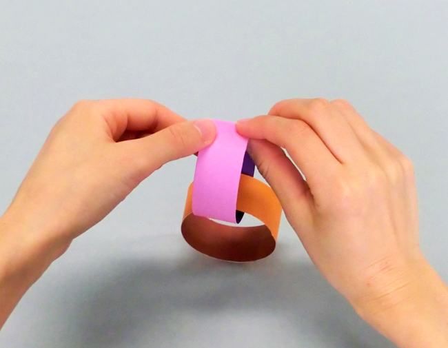 ②切った色がみの端を、のりで貼り合わせます。できた輪に次の色がみを通し、つないでいきましょう。