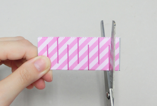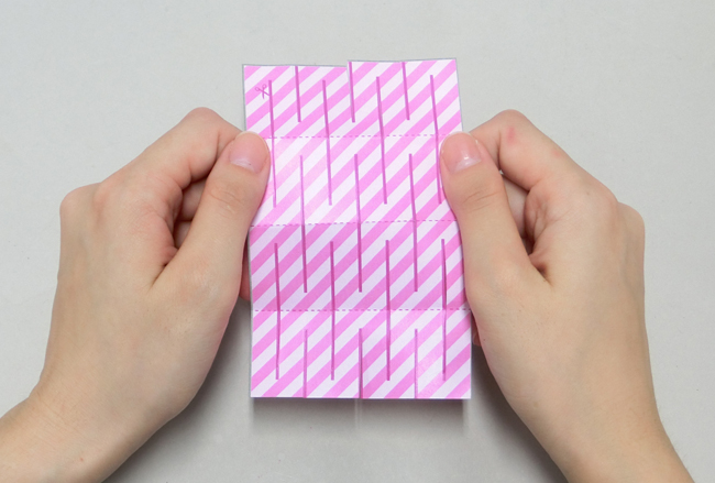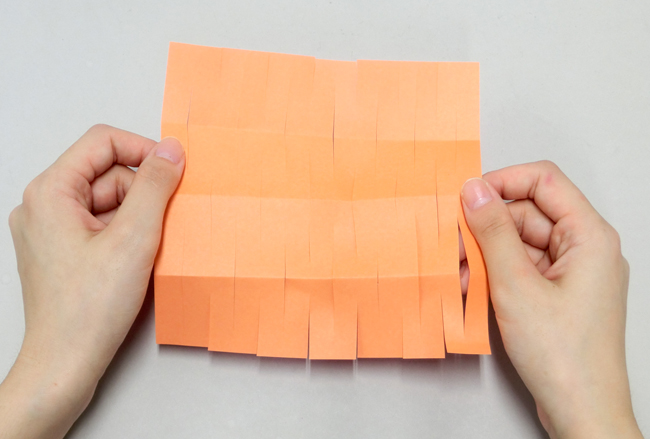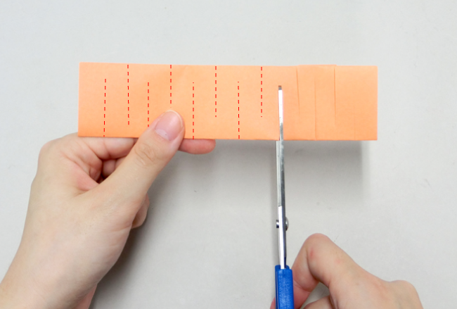 ④紙を折ったまま、濃い色の太線にそって切り込みを入れます。