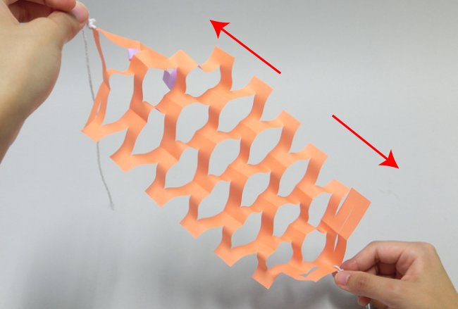 ②たこ糸を上下の穴に結びつけ、別の飾りをつなげると、あみが引っ張られてきれいに広がります。