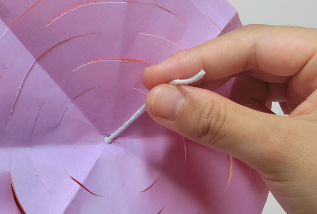 ⑤同じように、下の穴のすぐ内側のたこ糸にもセロハンテープを巻きつけると、かごを広げて飾ることができます。