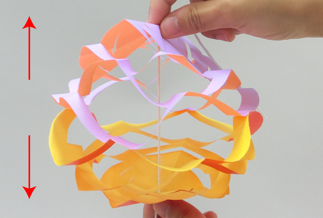 ③穴にたこ糸を通した状態のまま、かごを上下に引っ張ってのばします。