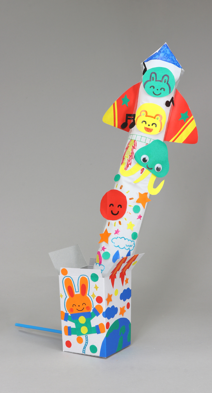 タテにとびだす作品をつくりました。袋の先をとがらせて、スペースシャトルをつくりました。また、色がみを切って窓や宇宙人をつくり、袋に貼ることで、にぎやかな様子を表現しています。