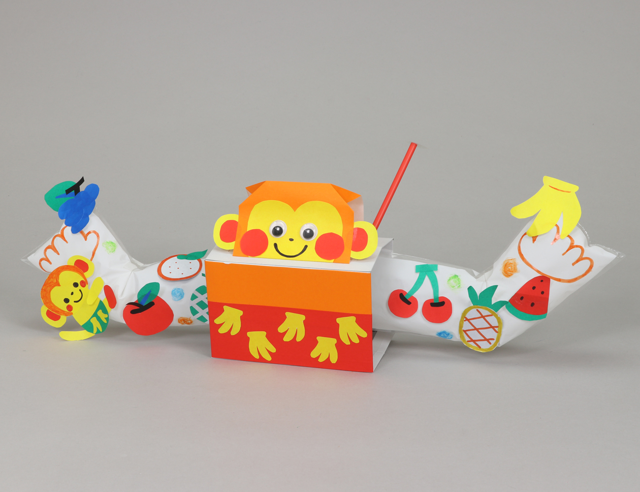 両側にとびだす作品をつくりました。袋の形を変えてサルの腕が曲がるようにしました。袋にクレヨンで模様を描いています。
