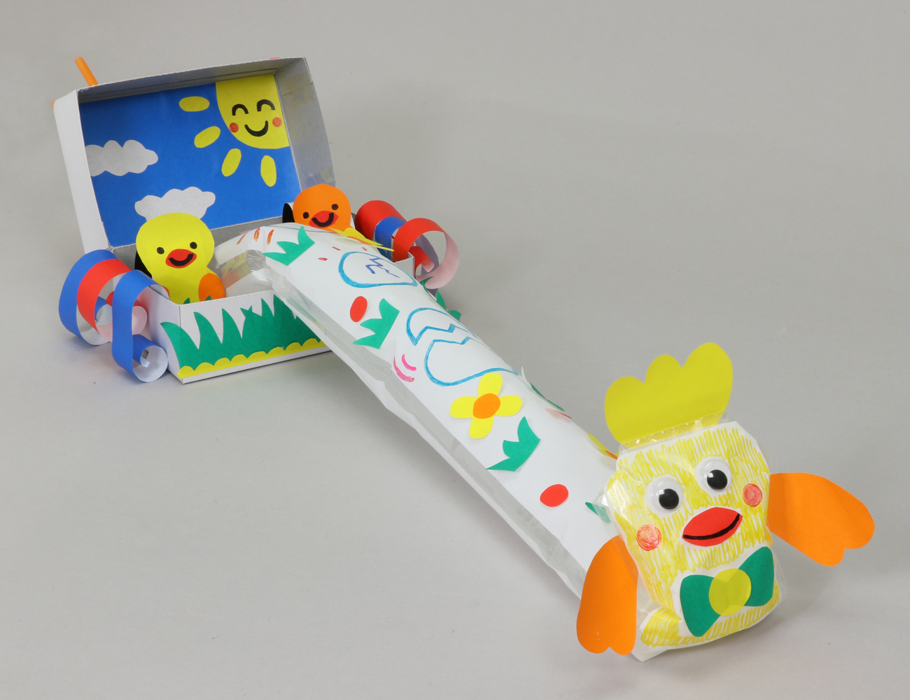 正面にとびだす作品をつくりました。袋の先の形を変えて、ふくらませたときにひよこが立つようにしています。