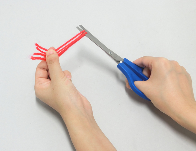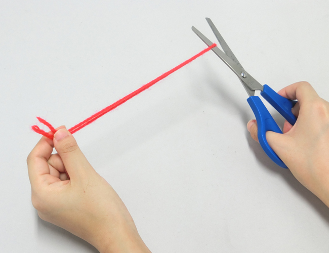 ①同じ長さに切る場合は、毛糸の端と端を合わせて2つに折れた部分を切ります。