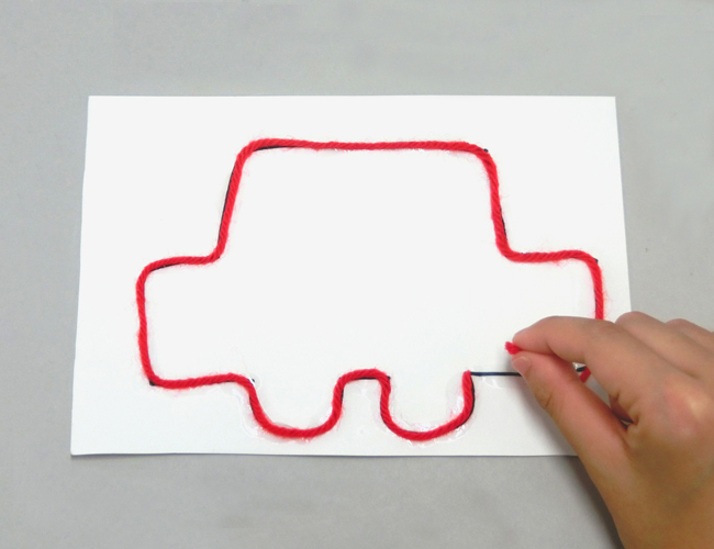②のりづけした毛糸を上から貼り、下書きの形に合うように調整します。