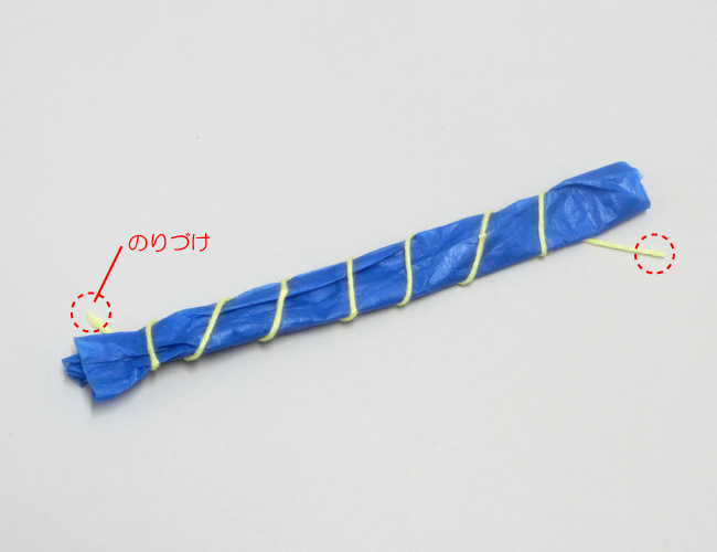 ①毛糸を細長く折ったおはながみに巻きつけ、端をのりづけします。