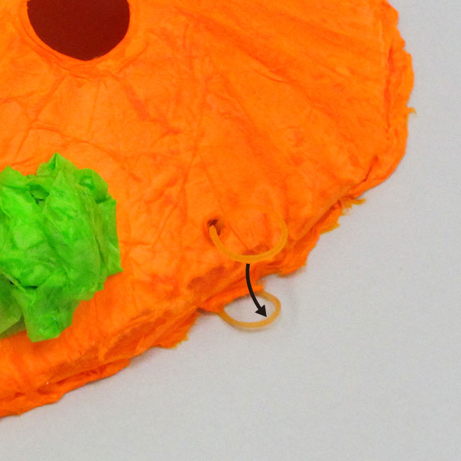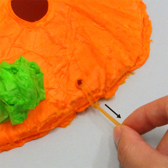 ③お面を破らないように輪ゴムの先端をそのまま引っ張っていきます。