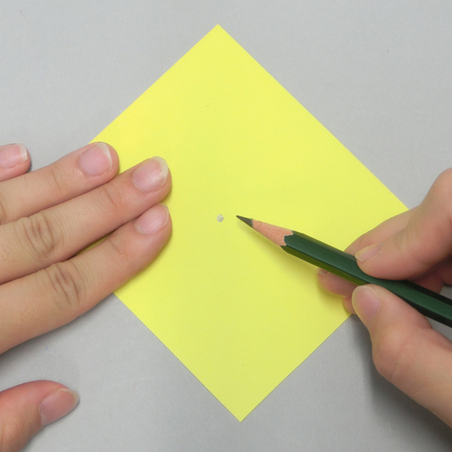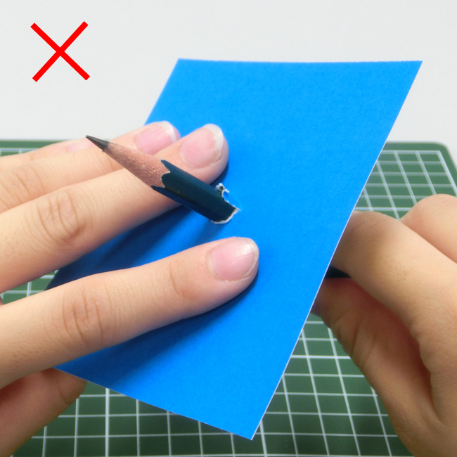 ③穴の回りに指をそえ、穴に鉛筆の先をさして回しながら約4mmまで穴をひろげます。