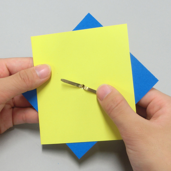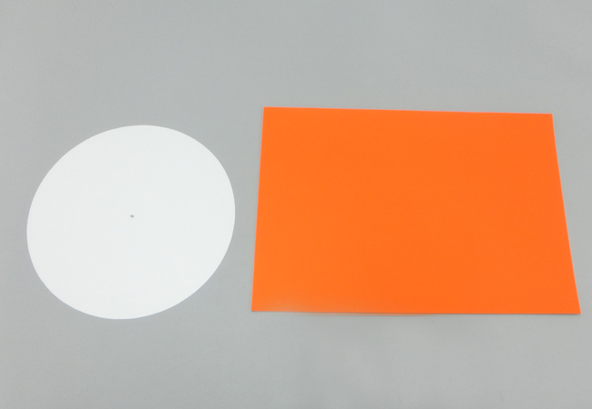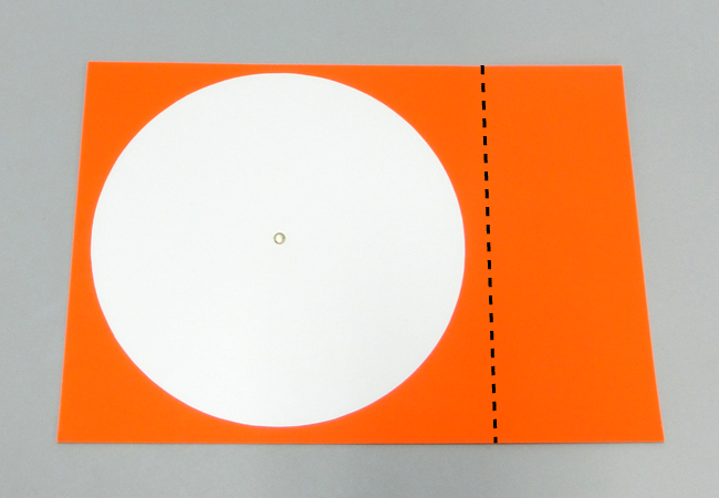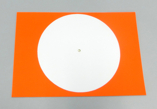 ⑤丸土台に穴をあけ、穴が重なるように紙を重ねて、割りピンをつけます。