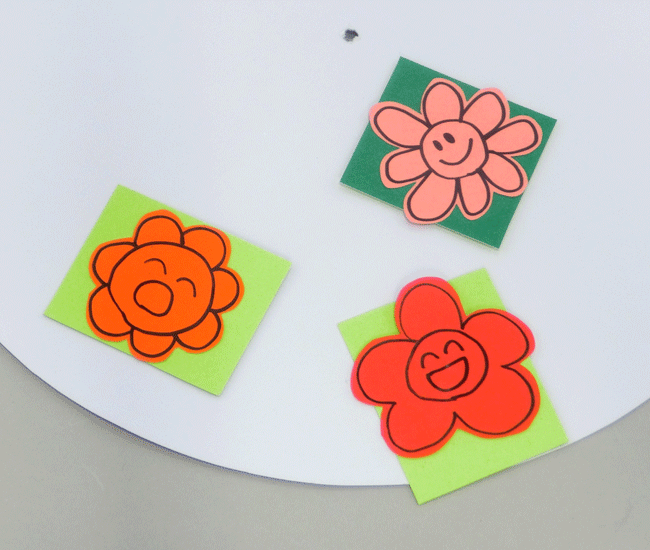 お花が回るお花畑をつくりました。飾りを上から貼りつけることで、割りピンの頭をかくしています。