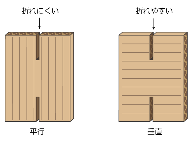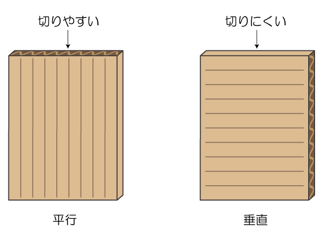 ダンボールは目に対して平行に切ると切りやすく、垂直に切ると切りにくくなります。また、組むときも目に対して垂直に切り込みを入れるとダンボールが折れやすくなるため、しっかり組みたいときは目に対して平行に切り込みを入れましょう。