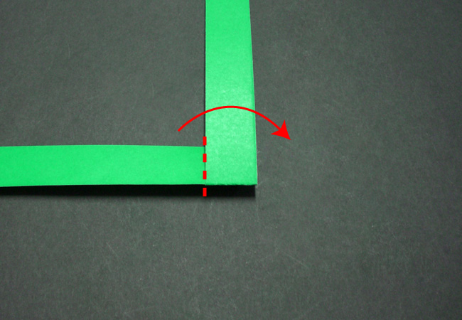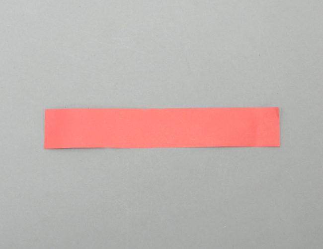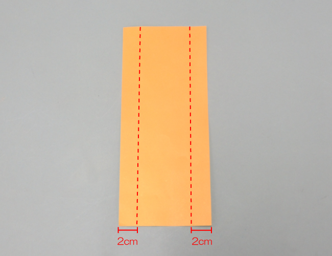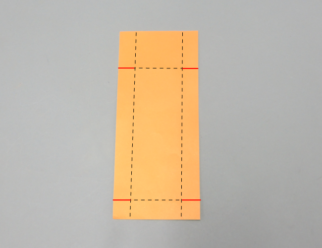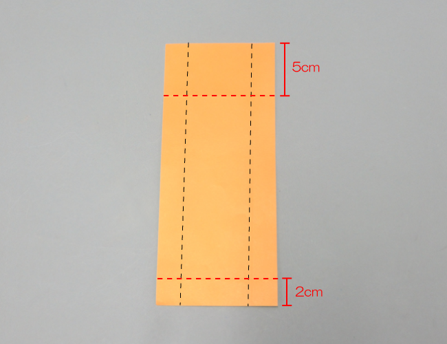 ②折ったものを一度ひらきます。すべり台の上から約5cmと下から約2cmの赤点線部分を折り、開きます。
