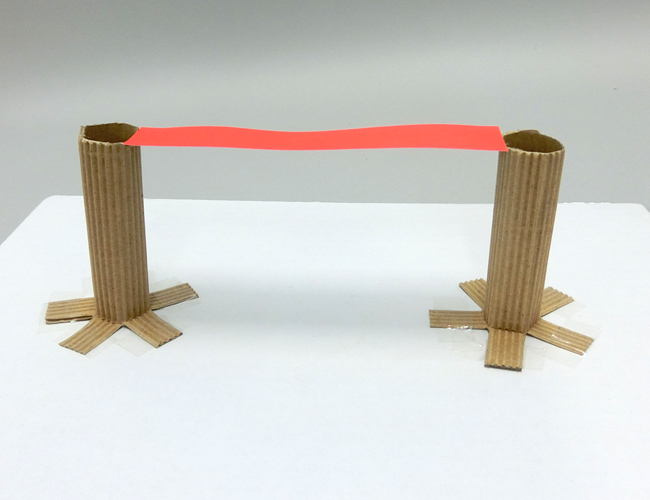 ②片面ダンボールでつくった支柱にのりまたは、セロハンテープで取りつけて、完成です。