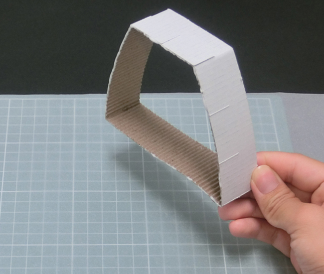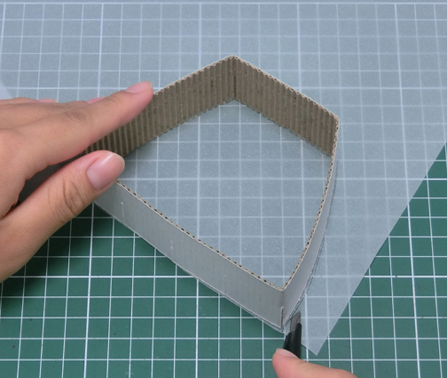 トレーシングペーパーの貼り方 ①ダンボールテープの側面に接着剤をつけて、トレーシングペーパーに貼ります。 ②接着剤が乾燥したら、トレーシングペーパーが貼ってある面を下にして、ダンボールにそってカッターで切ります。 ③トレーシングペーパーをきれいにダンボールの形に切ることができます。