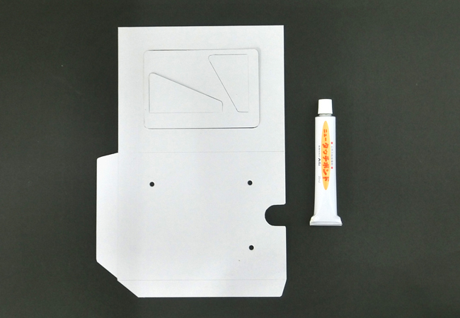 ⑨脚を折ったまま白い面を上にして脚以外の白い部分に木工用接着剤をぬります。はみ出したり、脚以外に木工用接着剤がつくと脚が開かなくなるので注意しましょう。