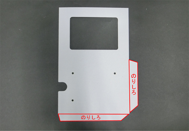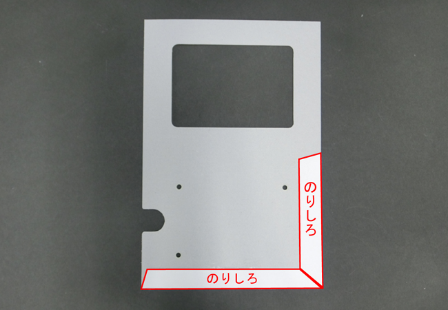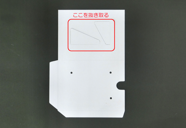 ⑩脚を裏面の左下に合わせて裏面からはみ出さないように貼ります。このとき、向きに注意し、穴をふさがないようにします。