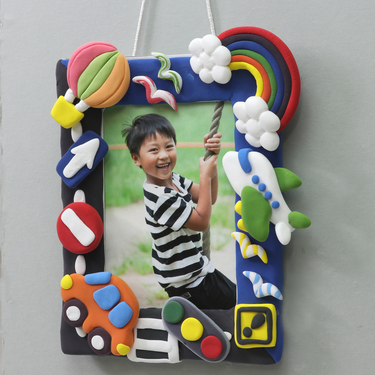 ヨコ向きの写真を入れてひもを使って壁に飾りました。