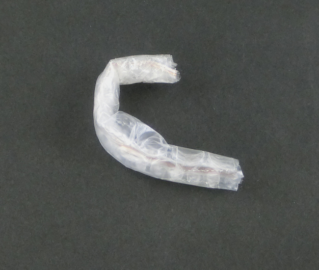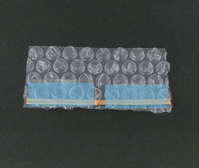 ②プチプチマットの端にビニタイを置き、セロハンテープを貼ります。