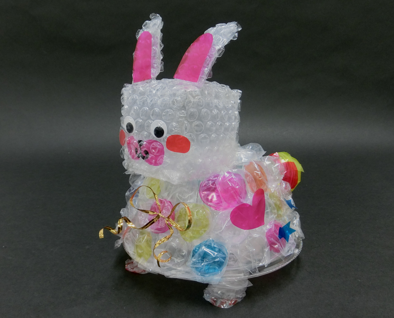 プチプチマットで四角形の箱をつくり、うさぎの顔として使用しました。うさぎの耳は長くて倒れやすいので、プチプチマットを2枚貼り合わせて倒れにくくしています。