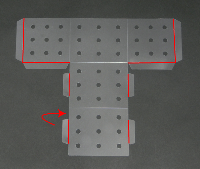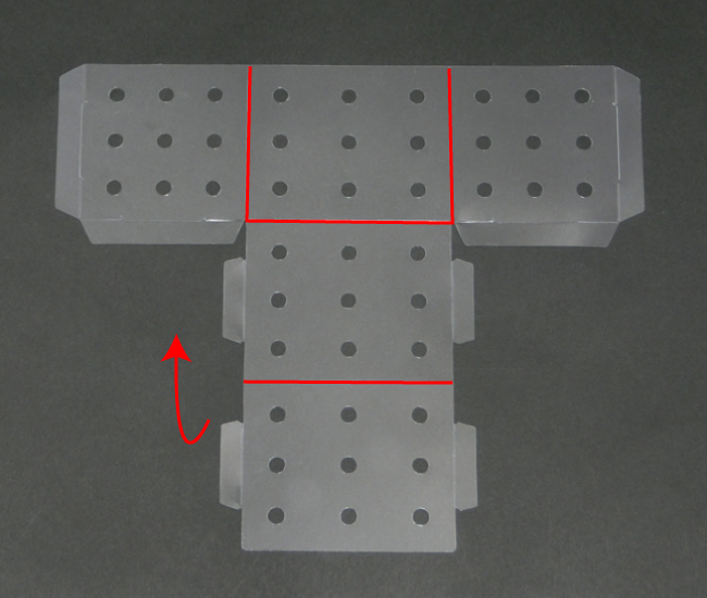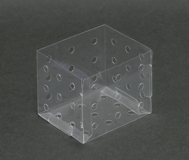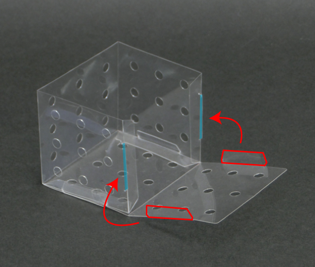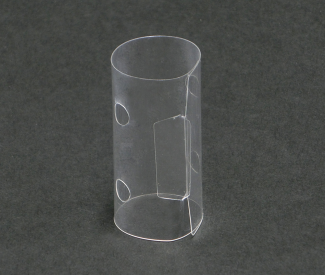 組み立て方 1.箱を組み立てる 2.筒を組み立てる 1.箱を組み立てる ①透明板のすべての面を内側に折りこみ、折り目をつけます。 ②すべての突起を内側に折りこみ、折り目をつけます。 ③透明板を折りながら、突起を角の穴にさし込みます。 ④すべての突起をさし込んで完成です。 2.筒を組み立てる ①透明板の突起を内側に折りこみ、折り目をつけます。 ②筒状に丸め、外側から突起を穴にさし込みます。 ③形を整えて完成です。
