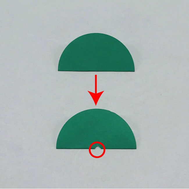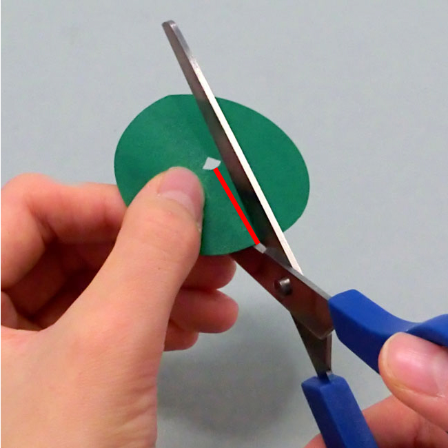 ②円を半分に折り、中心に小さな三角形をつくるように切り込みを入れて穴をあけます。