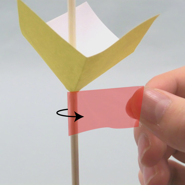 ①細長く切った色がみを竹ひごにセロハンテープで貼りつけます。