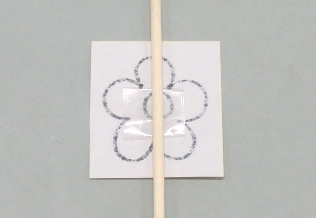 ④1枚の色がみの裏に③でつくったセロハンテープを貼り、竹ひごに貼りつけます。