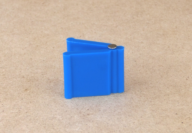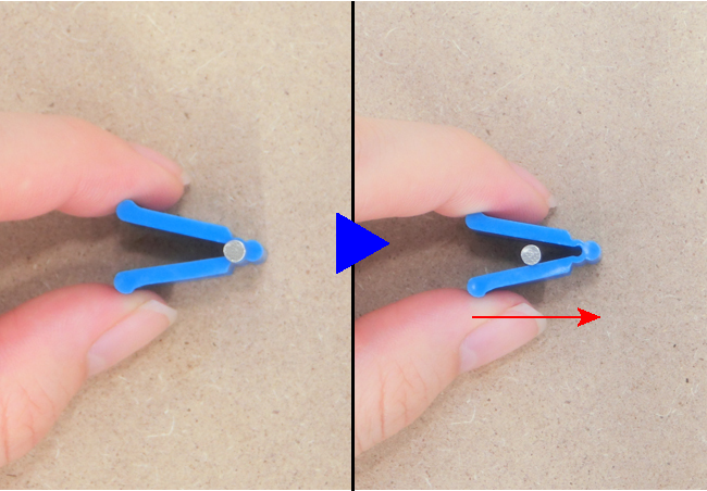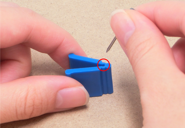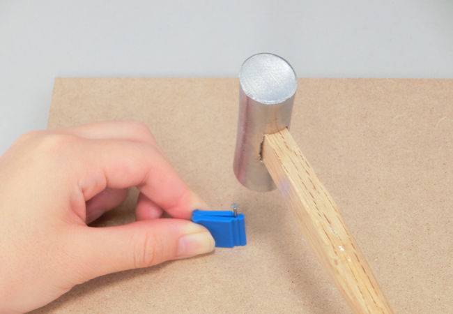 ①釘を打ちたい位置に釘ばさみを置き、先端に釘をはさみます。